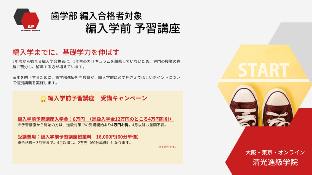 歯学部編入学試験に合格された方の多くが、「2年次から始まる専門科目の壁」に直面しています。